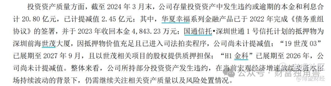 此外,横琴人寿还陷入了投资资产违约的风波之中。据大公资信的评级报告显示,横琴人寿的部分投资资产出现了违约情况。截至2024年3月末,横琴人寿存量投资资产中发生违约或逾期的本金和利息合计达到了20.80亿元,违约资产主要集中在房地产、信托计划等领域,部分项目的抵押物虽然价值充足且已进入司法拍卖程序,但仍未完全解决违约问题。虽然横琴人寿已对这些违约资产计提了2.45亿元的减值准备,但这一事件仍然对其财务状况和信誉产生了不小的冲击。