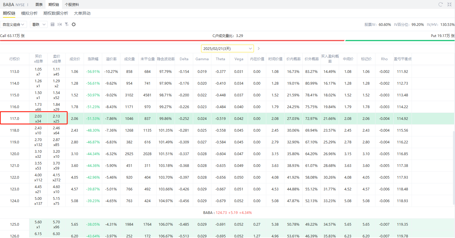 股票阿里巴巴目前交易价格为128.75美元。投资者可以通过以下操作实施空头宽跨式策略: