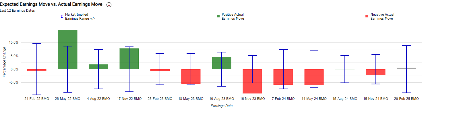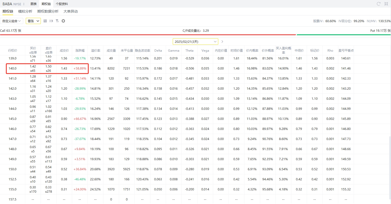 当前,阿里巴巴的隐含变动为±8.9%,表明期权市场押注其绩后单日涨跌幅达8.9%;对比来看,阿里巴巴前4季度的绩后平均股价变动为±3.5%,显示该股当前期权价值被高估。