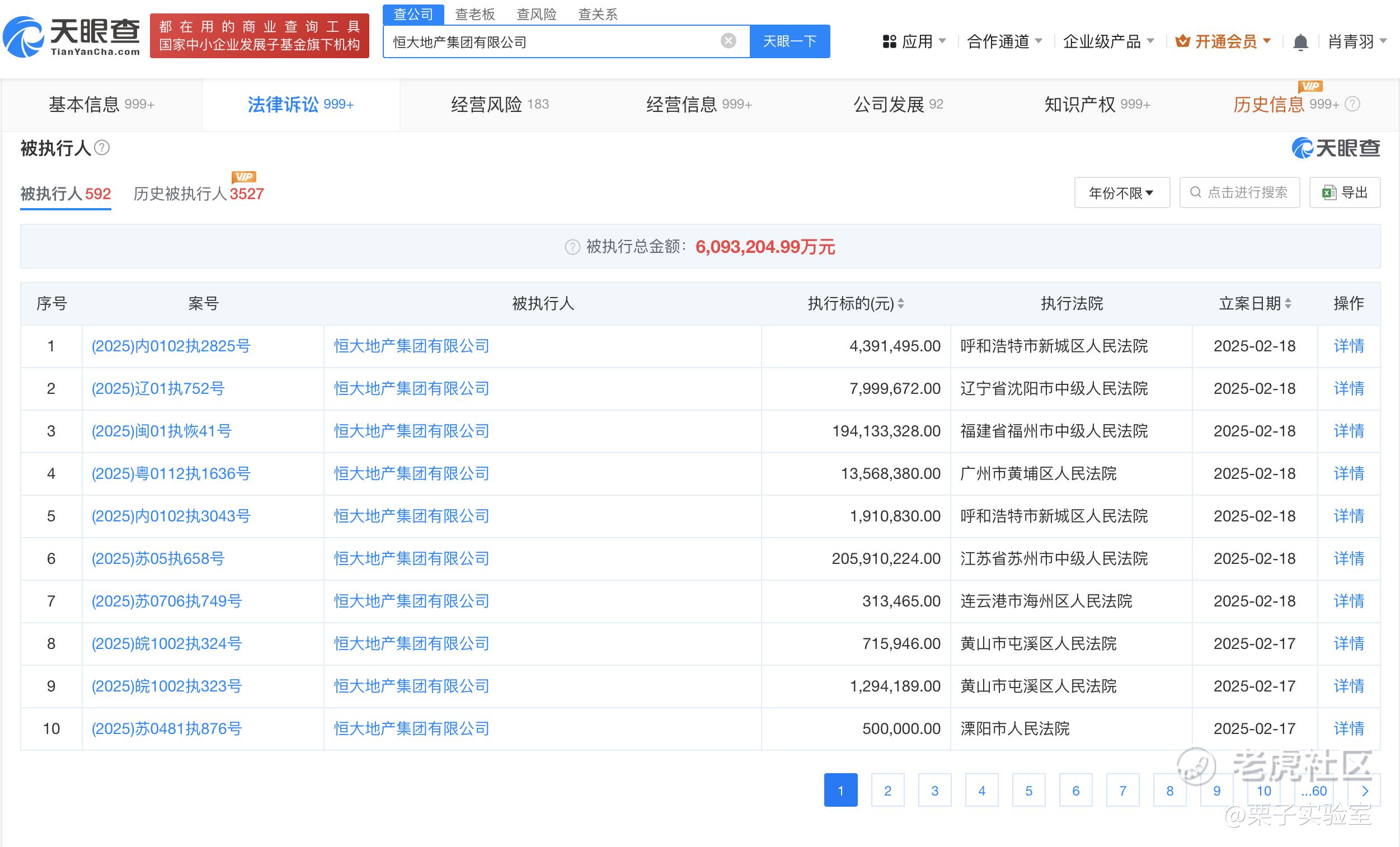天眼风险信息显示,恒大地产集团有限公司现存590余条被执行人信息,被执行总金额超609亿元。此外,该公司还存在多条限制消费令、失信被执行人(老赖)及终本案件信息。