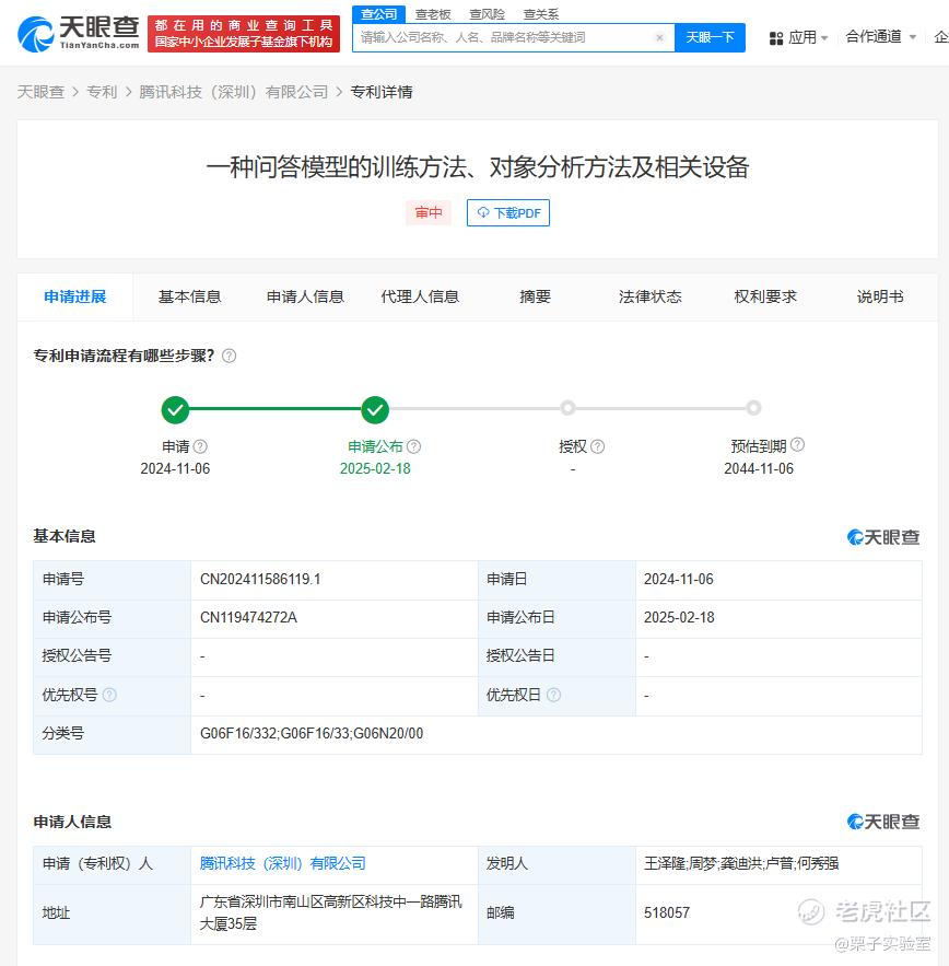 天眼查知识产权信息显示,2月18日,腾讯科技(深圳)有限公司申请的“一种问答模型的训练方法、对象分析方法及相关设备”专利公布。