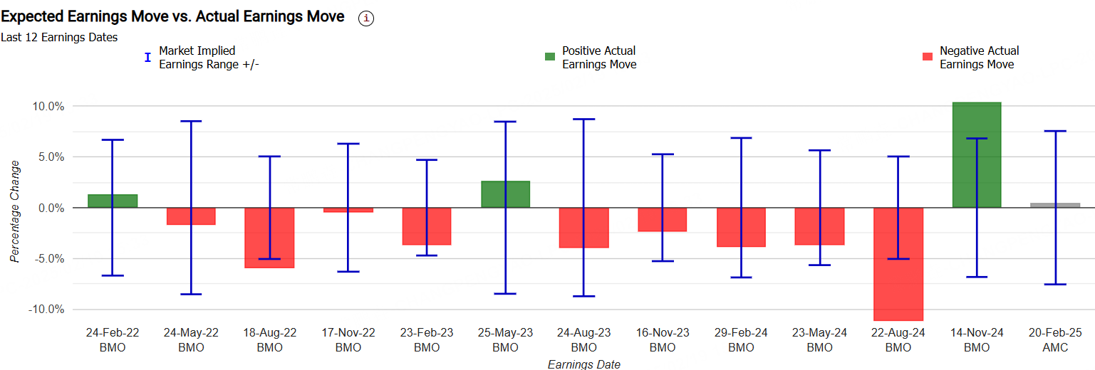 过去12个季度中,期权市场75%时间高估了NTES股票波动。盈利公告后的预测走势平均为±6.5%,而实际盈利走势的平均值为4.3%(绝对值)。