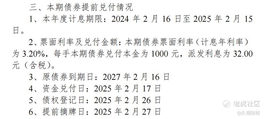 上海金茂投资管理集团有限公司2022年面向专业投资者公开发行公司债券(第一期)债券(以下简称“本期债券”)于2025年1月10日至2025年1月14日进行回售登记,根据回售登记结果,本期债券的回售申报金额为18亿元,故本期债券于2025年2月17日兑付本期债券剩余全额本金及2024年2月16日至2025年2月15日期间相应利息。完成本次付息、兑付、回售工作后本期债券将于2025年2月27日在上海证券交易所提前摘牌。