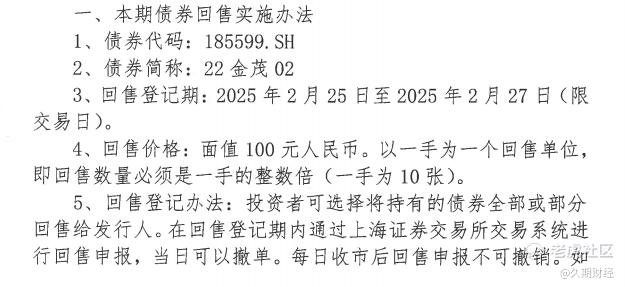 久期财经讯,2月19日,上海金茂投资管理集团有限公司(简称“上海金茂投资管理”)发布2022年面向专业投资者公开发行公司债券(第二期)(债券简称“22金茂02”)2025年债券回售实施公告。