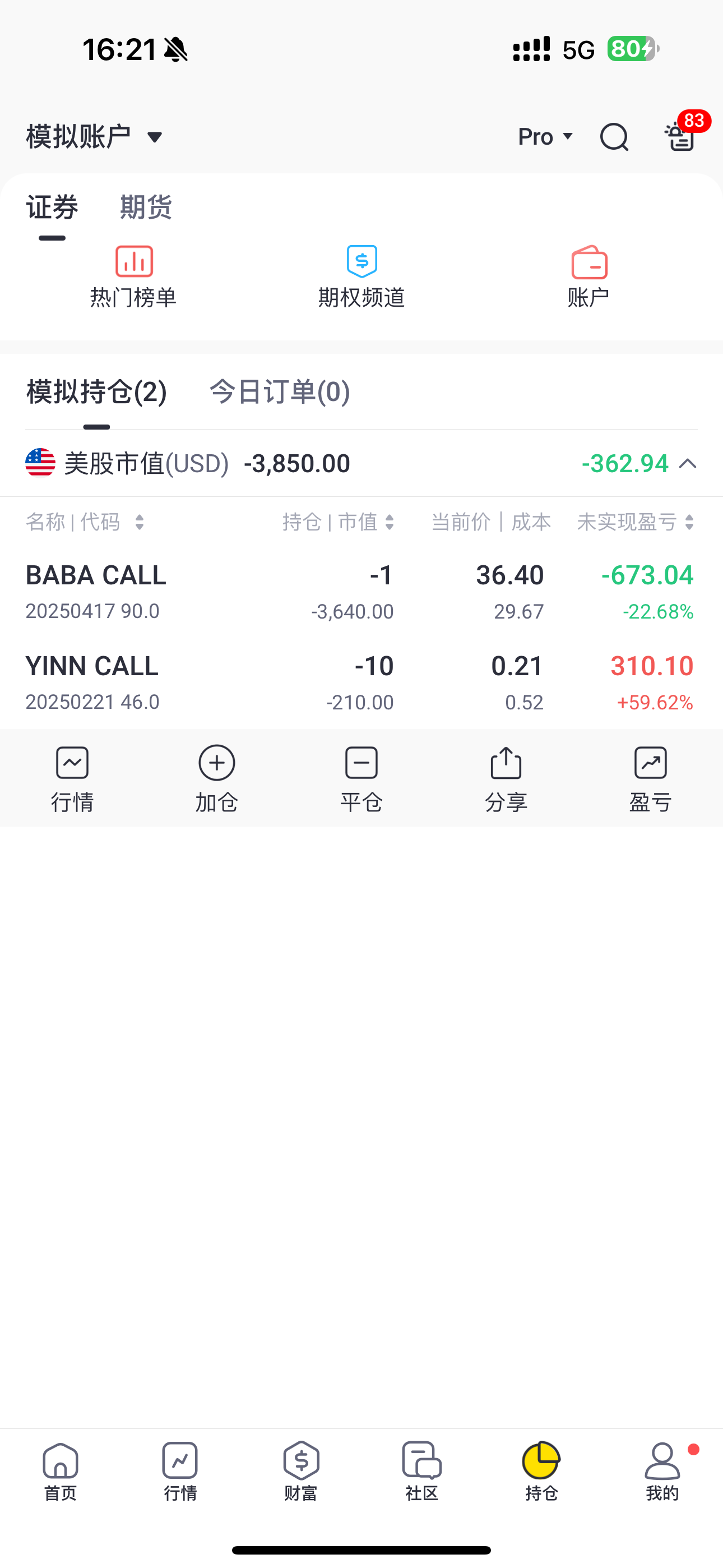 这里我们用最近爆火的 $三倍做多富时中国ETF-Direxion(YINN)$ 举例,我们在模拟盘做出了做空YINN的操作。