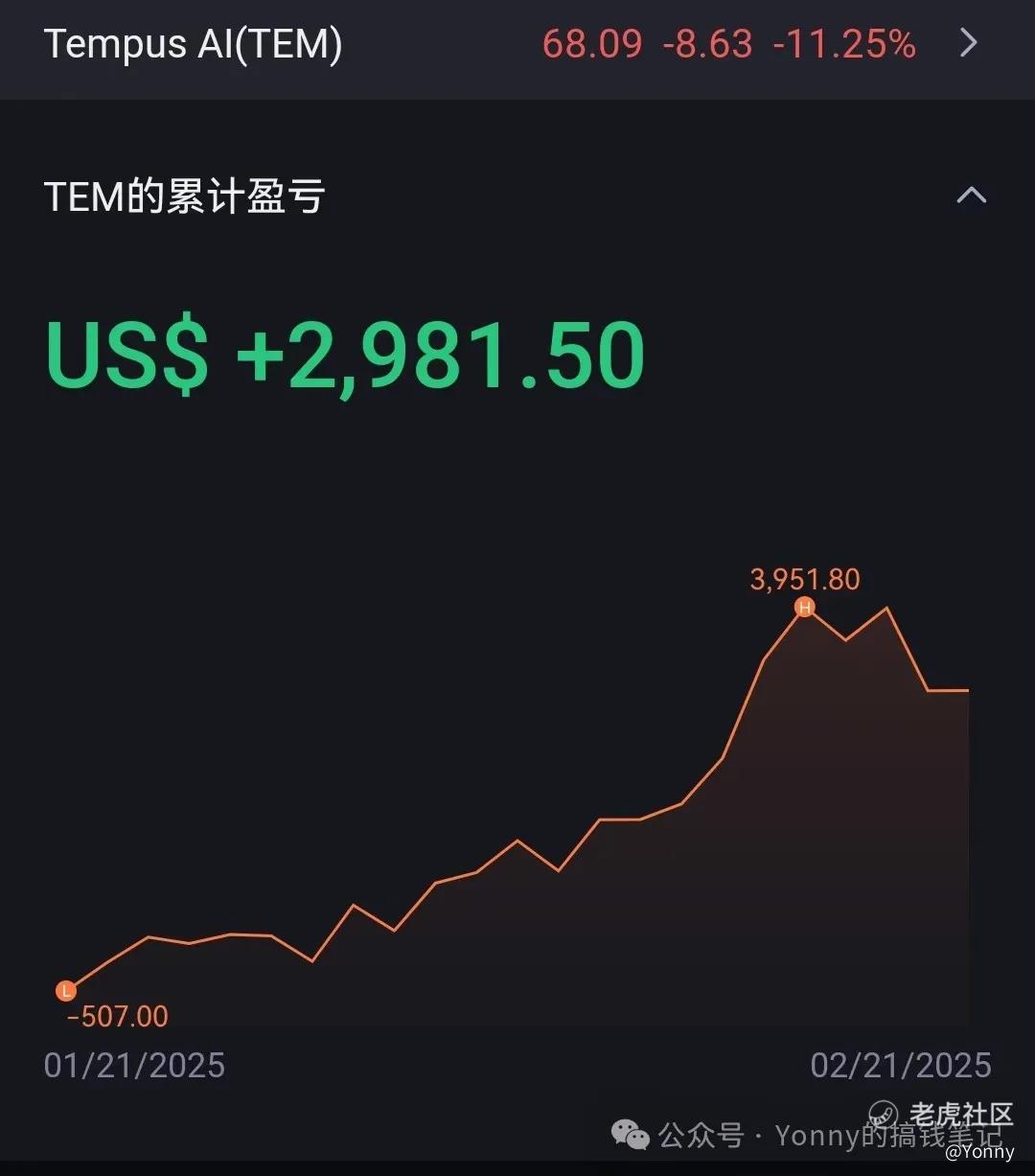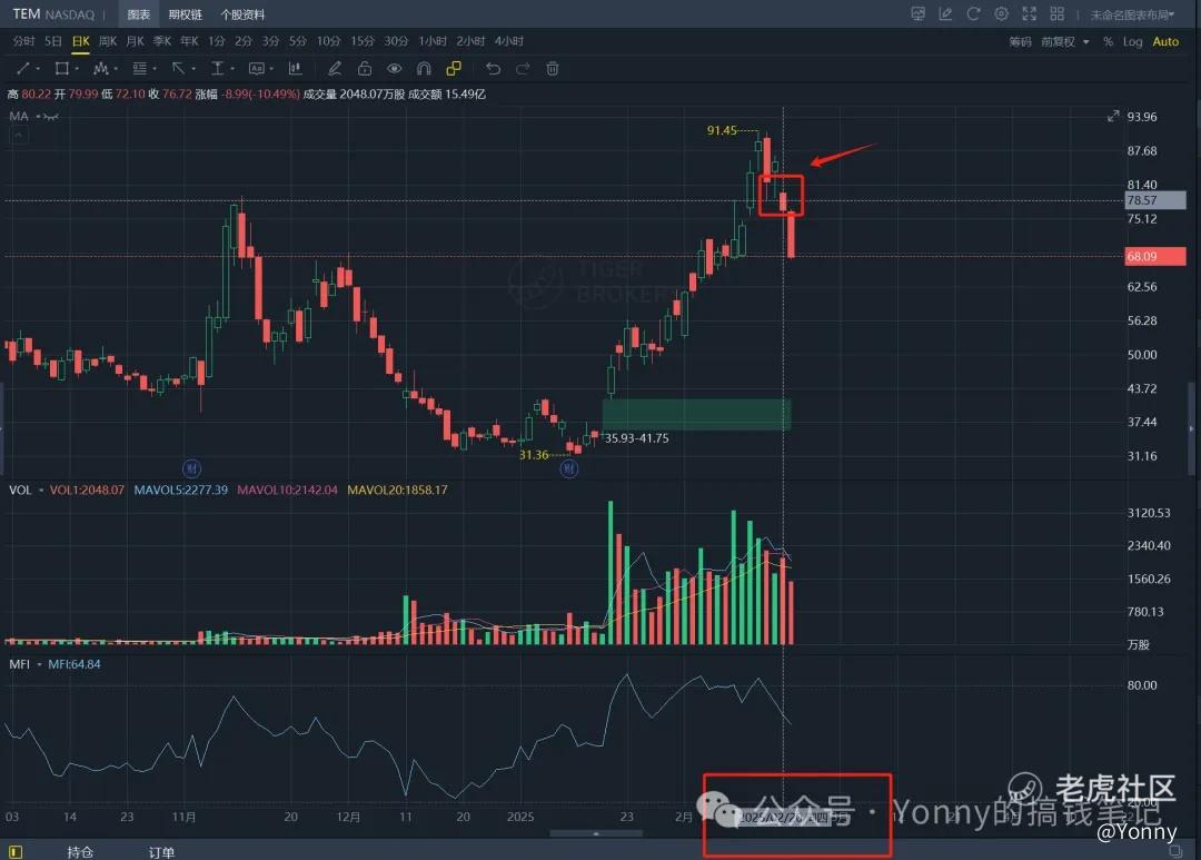 TEM:老妖婆的票,贯彻了sell in strenth的原则,在左侧减仓了一些。右侧第一根大阴线出来后,也完全清仓了。所幸利润没有回撤太多, 卖在了次高点。