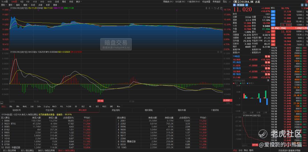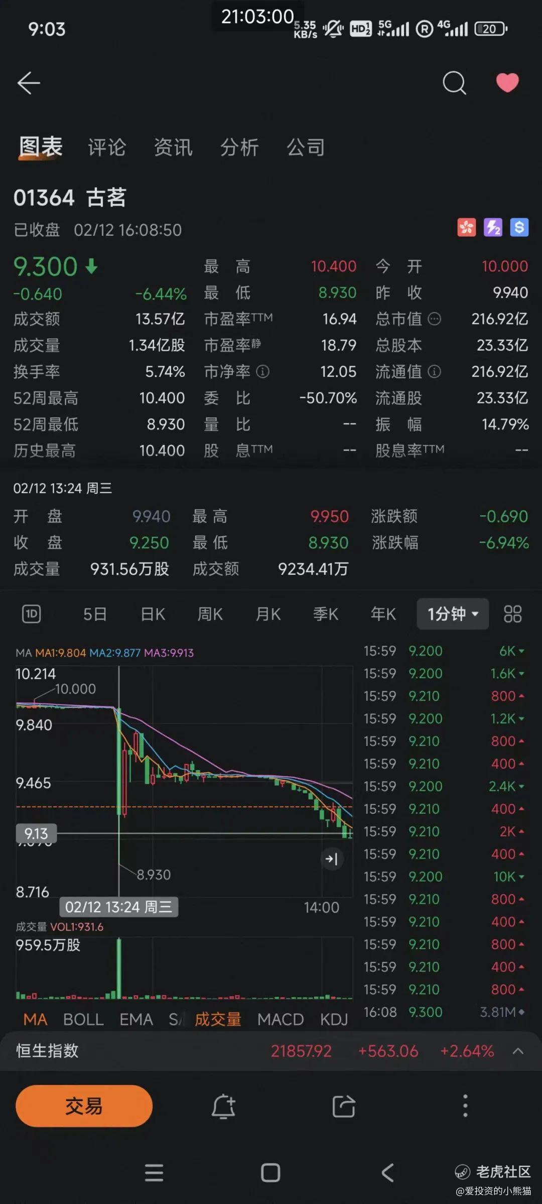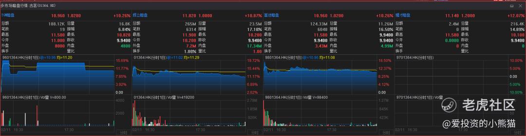 上市首日高开0.60%,这把一堆人给惊呆了,大盘可是涨了10个点了,到首日已经要亏钱了。冲高到10.40港元回落震荡,截止到中午收盘收涨了0.40%,这个票是比较热的,公配194.87倍,结果昨日走成这样了,到下午一笔订单在一分钟来了一个亿的砸盘,直接把买盘所有的档位都打穿掉了,第1次见到砸盘这么猛的新股,要知道暗盘总共才成交两个多亿,结果这一分钟时间打完了,成交这一个亿之后直接股价就朝着暴跌去了,稍作反弹之后又继续下探,首日尾盘以低点收盘。