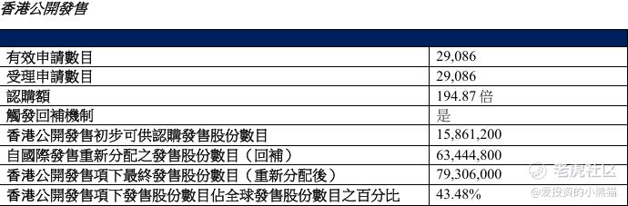 古茗 (01364.HK) 招股最终定价9.94港元,在招股价8.68港元-9.94港元的上限价,15.77亿港元的募资,234.22亿港元的总市值,发行比例7.74%。配售情况:29086人认购,这次公配194.87倍,由于超过100倍,回拨比率43.48%(按理说应该是50.00%),国配有15.03倍,一手中签率100.00%,认购1手才必中1手,同时乙组1638人申购,其中顶头槌申购44张,获配率0.31%-4.00%,乙头比甲尾中签率多10倍。