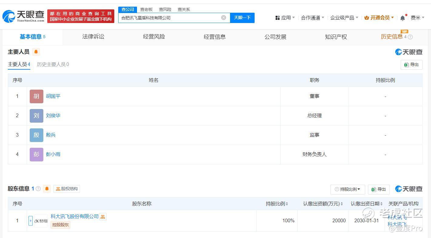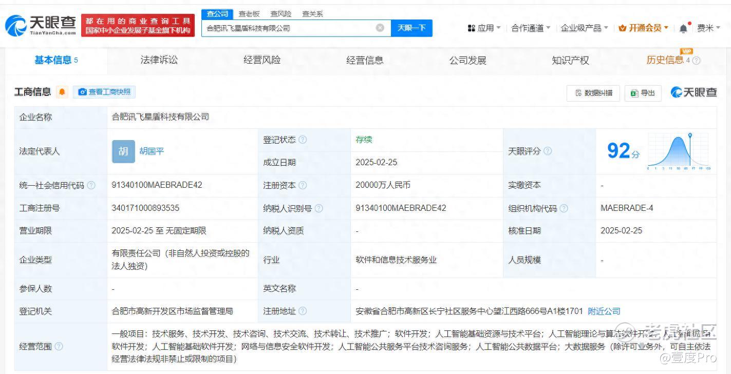 天眼查App显示,近日,合肥讯飞星盾科技有限公司成立,法定代表人为胡国平,注册资本2亿人民币,经营范围含软件开发、人工智能基础资源与技术平台、人工智能理论与算法软件开发、人工智能应用软件开发、网络与信息安全软件开发、大数据服务等,由科大讯飞(002230)全资持股。
