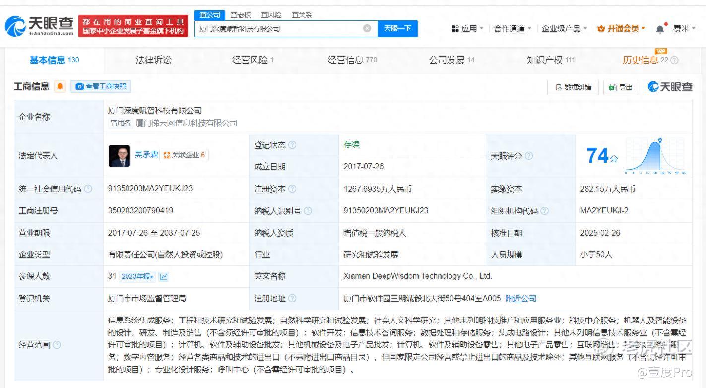 该公司成立于2017年7月,法定代表人为吴承霖,经营范围含信息系统集成服务、工程和技术研究和试验发展、自然科学研究和试验发展、社会人文科学研究、科技中介服务、软件开发等,现由吴承霖、厦门玄荐咨询管理合伙企业(有限合伙)、厦门梅花盛世股权投资合伙企业(有限合伙)等及上述新增股东共同持股。公开资料显示,该公司提供全自动AI中台,致力于让每个客户具有开箱即用的AI能力。