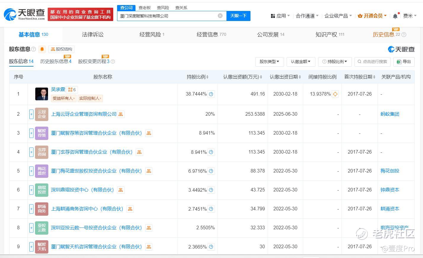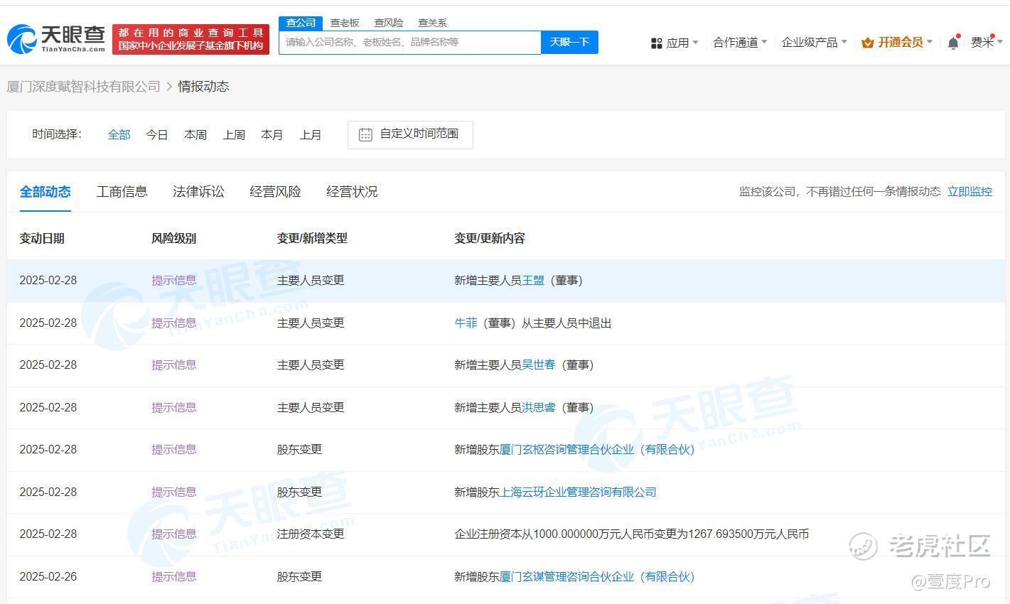 天眼查App显示,近日,厦门深度赋智科技有限公司发生工商变更,新增蚂蚁集团旗下上海云玡企业管理咨询有限公司、厦门玄枢咨询管理合伙企业(有限合伙)等为股东,注册资本由1000万人民币增至约1267.7万人民币,同时多位高管发生变更。