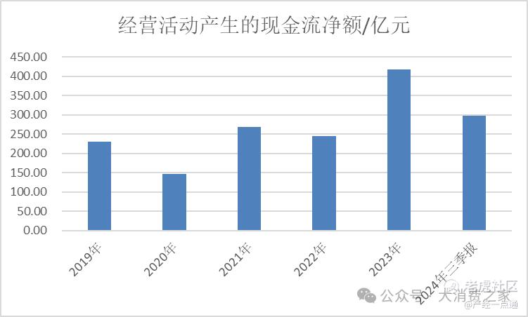 近年来,五粮液的业绩保持增长态势,2023年归母净利润已突破300亿元。受此推动,公司经营活动现金流也持续攀升,截至2024年三季报已达297.94亿元。