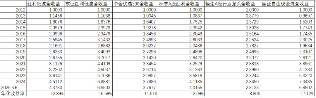 红利低波全收益指数4.3780倍,年化收益率是12.89%;