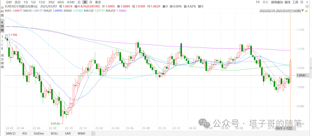 外汇方面,由于全球去美国化,美国经济前景不佳,德国历史性发债等,美元指数录得2022年底以来最大单周跌幅,,抹平特朗普当选以来涨幅,而欧元兑美元单周大涨超4%,为2009年美联储开启QE以来最佳表现。