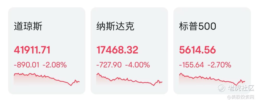 受此影响,美股周一大幅下跌,三大指数集体收跌。标普500指数一度跌超3%,纳指盘中跌幅超过4%,道指最多下跌近1190点,跌幅接近2.8%。