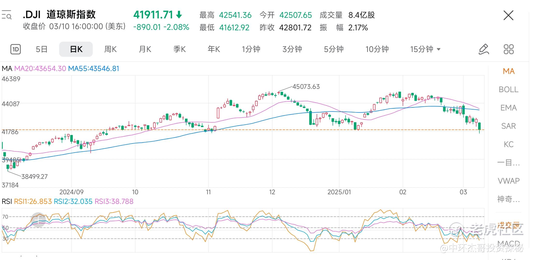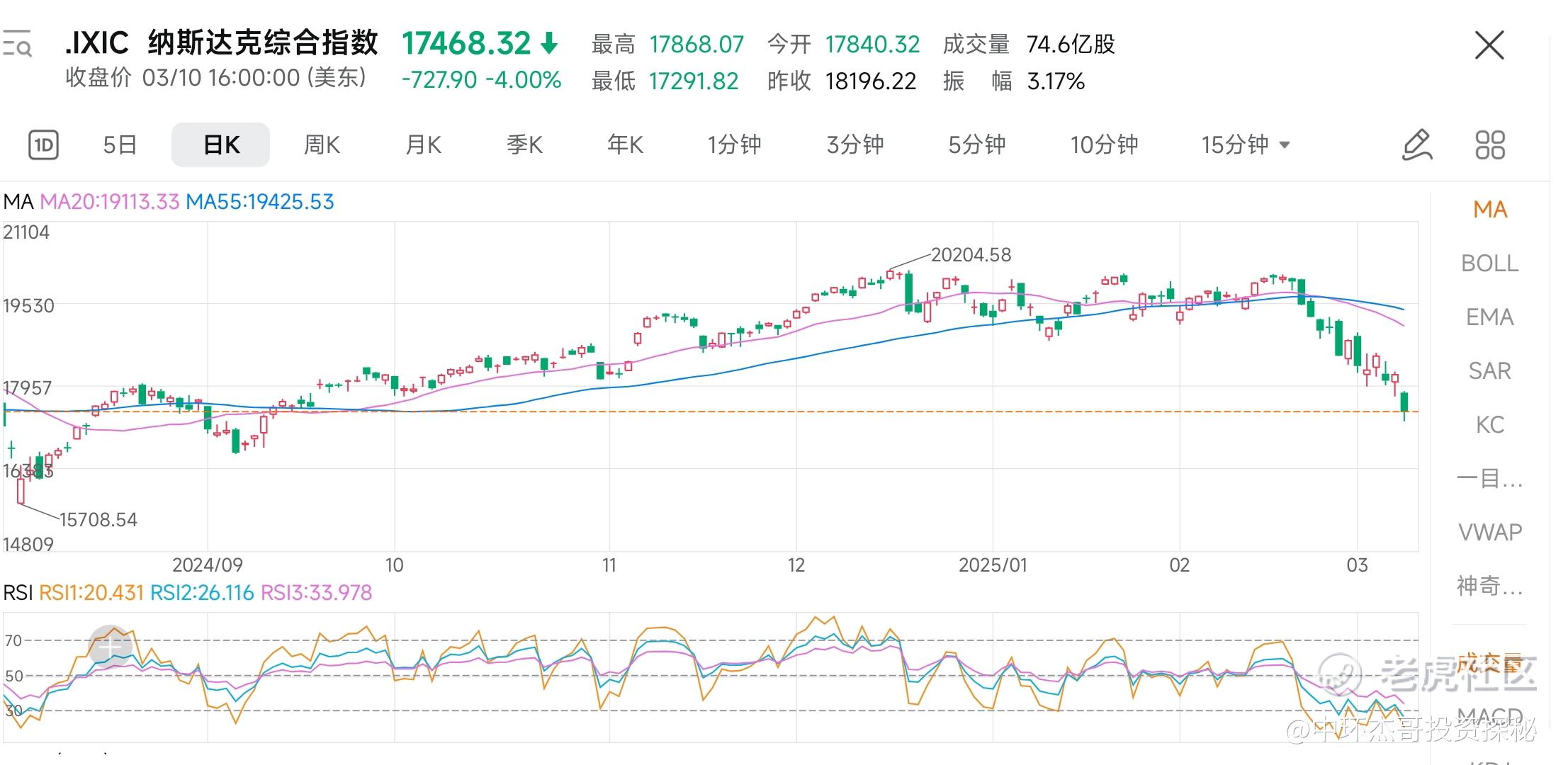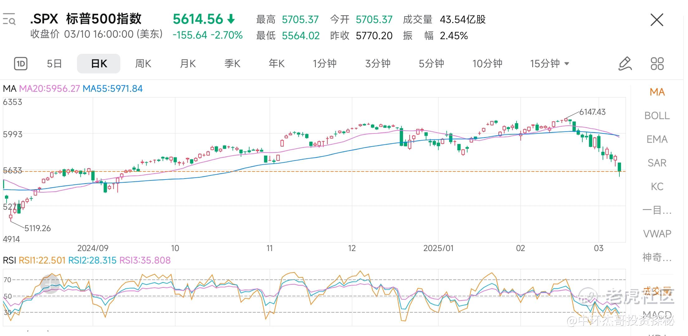 纳斯达克,日线和周线指标都是超卖严重,连日暴跌,我们发现指标背离极其严重,就是不创新低,周线达到55天线附近,更重要的是,纳指已经大跌~14.5%,这说明了什么。