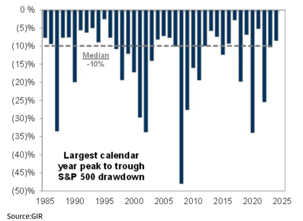 平均日历跌幅能很好地提醒我们(下图),10% 的跌幅是常态。我们将观察此次情况如何发展,但鉴于增长、通胀、关税、消费者状况存在不确定性,且估值仍处于高位,市场形势愈发严峻。