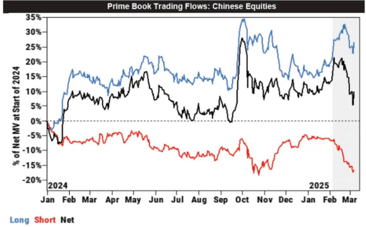 自 DeekSeek 事件以来,截至 2 月 17 日,从年初至今(YTD )的主经纪商业务数据来看,中国是名义净买入最多的市场。此后,对冲基金改变了资金流向,年初至今流入中国股票的资金流目前基本持平。