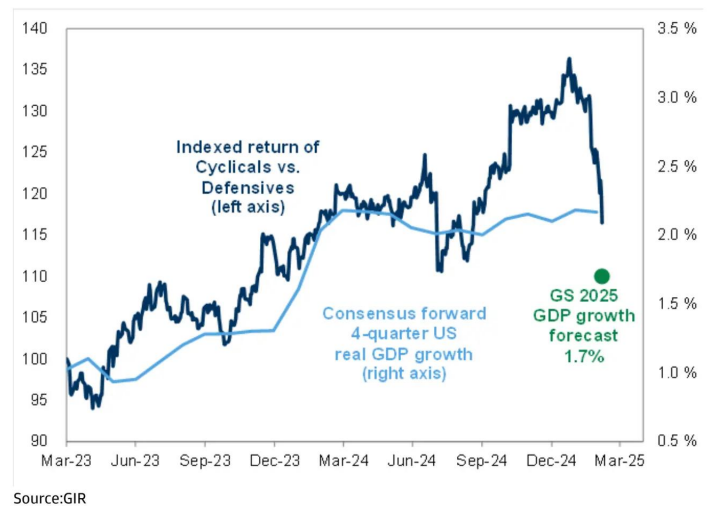 周期性股票与防御性股票目前的定价反映出美国实际国内生产总值(GDP)增长率约为 2%,这仍略高于我们经济学家的基准增长预测,也高于 2024 年夏季增长恐慌时期的谷底水平以及 2023 年市场所反映的疲弱增长环境下的水平。经济数据疲软可能会导致股票 / 周期性股票进一步下跌。