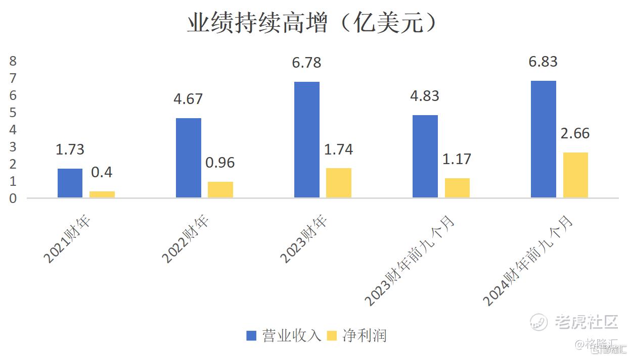 净利润则从2021财年3971万美元飙升至2023财年1.74亿美元,复合增速达到109.04%;2024财年前九个月,净利润同样保持高速增长,同比提升126.78%至2.66亿美元。