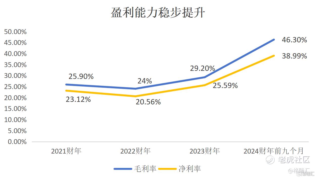 随着公司产能持续扩大释放出来的规模效应,整体盈利能力也在持续走高。公司毛利率从2021年财年25.9%增长到2023财年29.3%,并于2024财年前九个月进一步提升到46.3%。同期,净利润率亦从23.12%逐渐提升至38.99%。