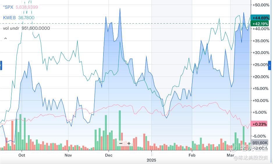(RERE最近六个月走势,VS绿线KWEB,红线标普500)