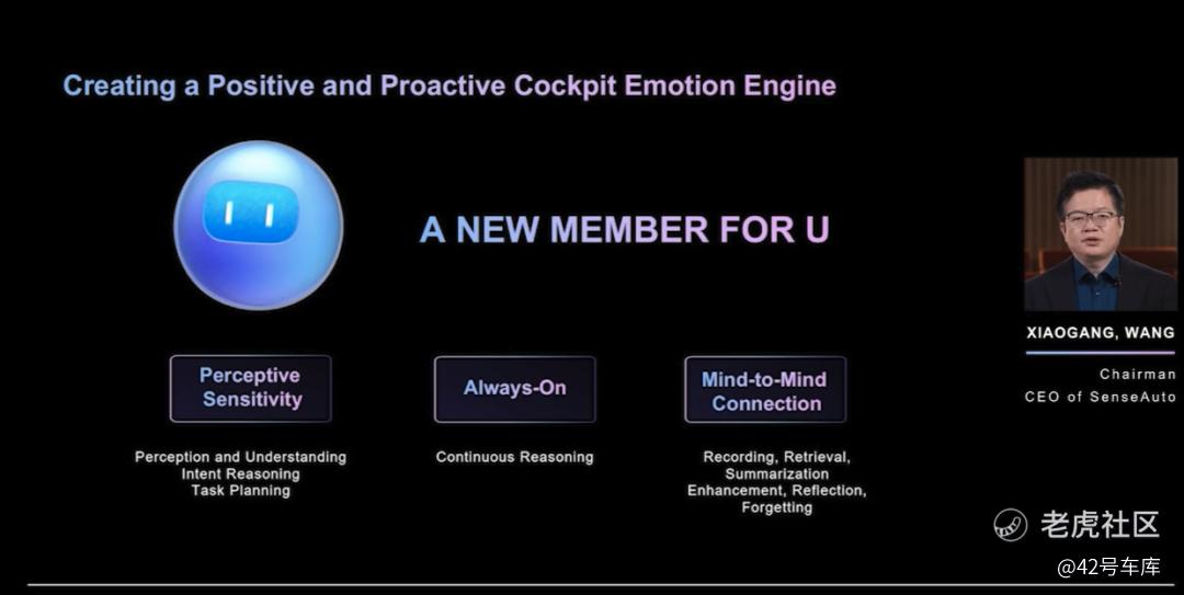 「A NEW MEMBER FOR U」是一个情感陪护伙伴,在去年 11 月份就发布了。据王晓刚分享,「A NEW MEMBER FOR U」感知敏感性、互动积极性都非常高,它可以持续推理用户需求,记忆自我进化,记住用户生活习惯,甚至是主动提醒在车内吃糖的小朋友少吃糖。
