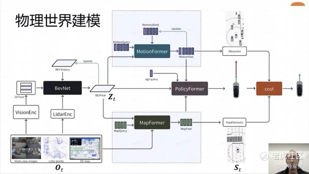 对应神经网络中的输入层、中间层以及输出层。其中数据观测层需要图像、激光雷达点云、导航信息(Ot),通过 BEV 编码网络,得到 BEV 的隐式表达(Zt),通过不同的解码器,得到动态元素、静态元素、未来轨迹。经过不同的建模方式,最终经过人工建模的 Cost(包括碰撞 Cost、车道偏移 Cost、舒适性 Cost)约束轨迹的合理性。