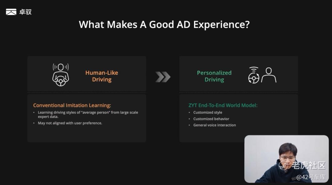 在英伟达 GTC 上,卓驭 AI 首席技术官陈晓智指出一个问题 —— 当前的端到端智驾,其通过数据训练所学到的驾驶能力是一种平均风格,但在实际驾驶中,每个人都有自己的独特的风格,所以端到端智驾与真实人驾还有很大的差距。