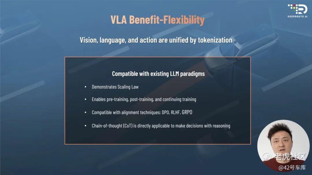 实际上,VLA 模型有相当多的优势,其中最大优势之一就是与现有的大语言模型范式兼容。其中 VLA 模型同样遵从 Scaling Law,随着模型参数提升,性能也会提升。同时,用预训练、后训练、持续训练改进模型。同时还兼容 DPO、RLHF、GRPO 等技术。并且,思维链可以直接用于推理决策(潮汐车道的思考)。