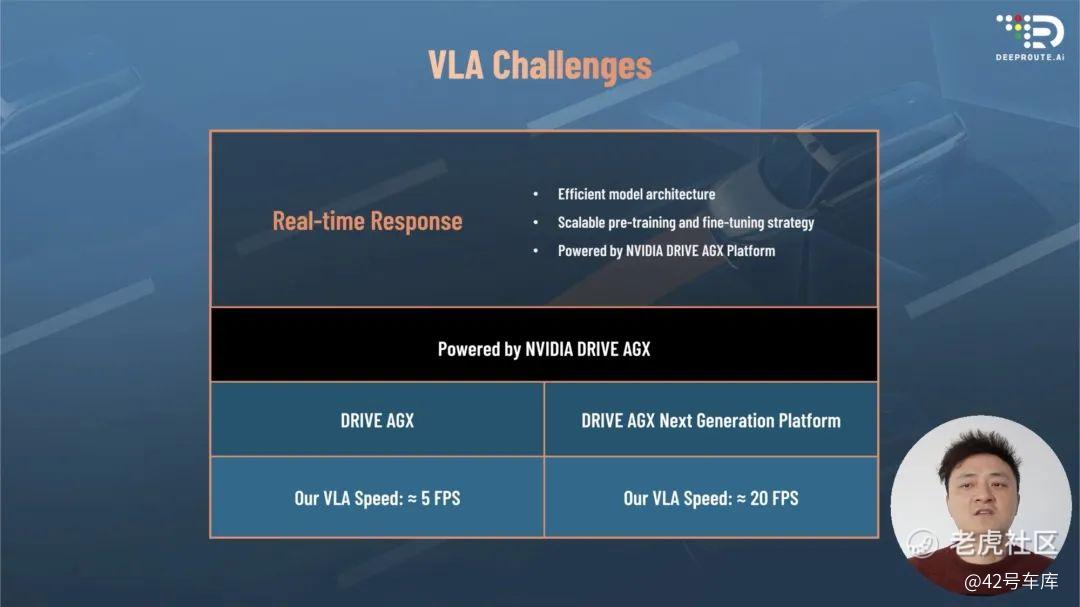 • 最重要的是实时响应的能力。基于英伟达 AGX 平台,当前一代产品 VLA 的处理速度大约是 5 FPS,下一代平台的速度是 20 FPS。