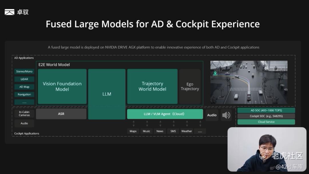 根据官方信息,卓驭的「生成式智驾体验」基于英伟达 DRIVE AGX 平台打造。同时,卓驭还基于该平台打造了一套舱驾一体的融合大模型,陈晓智表示,简单地说,其实就是智驾域和座舱域共享一套 LLM 大模型。