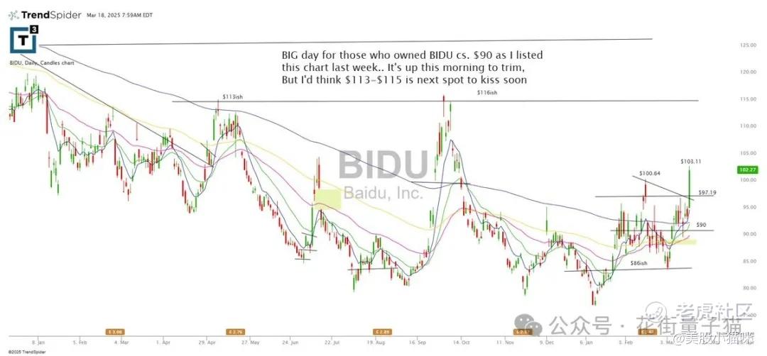 对于持有BIDU约90美元的投资者来说是个大日子,因为我上周列出了这张图表。今天早上上涨了一些,可以部分减仓,但我认为113-115美元是下一个即将触及的目标。