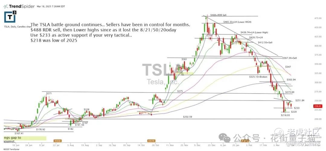 TSLA 依然是战场,卖方几个月以来一直占据主导地位。488 美元 RDR 卖点后,持续走低,高点不断降低,自失守 8/21/50/200 日均线以来一直疲软。如果你是短线交易者,可将 233 美元作为活跃支撑位。218 美元是 2025 年以来的最低点。