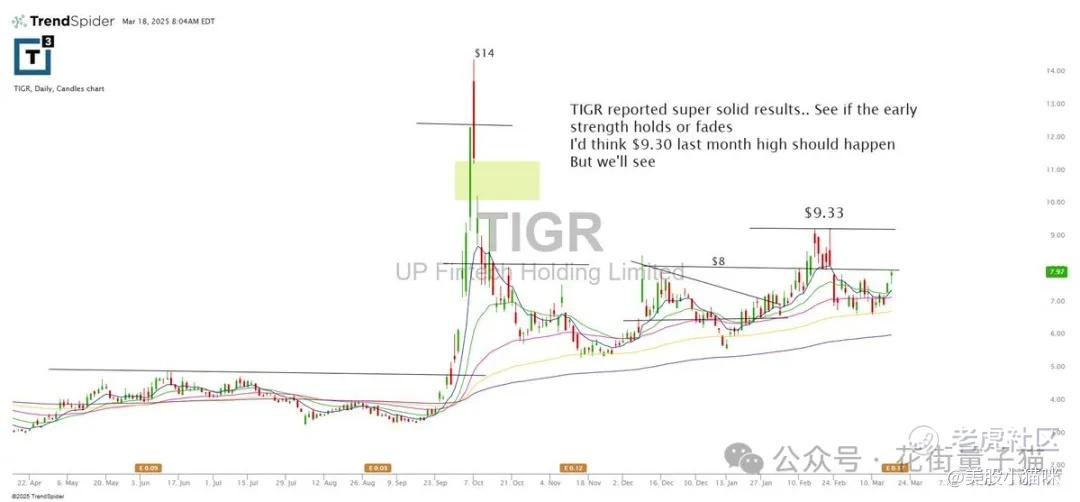 TIGR公布了非常强劲的业绩,看看早盘的强势能否保持或回落。我认为9.30美元(上个月高点)应该会达到,但让我们拭目以待。