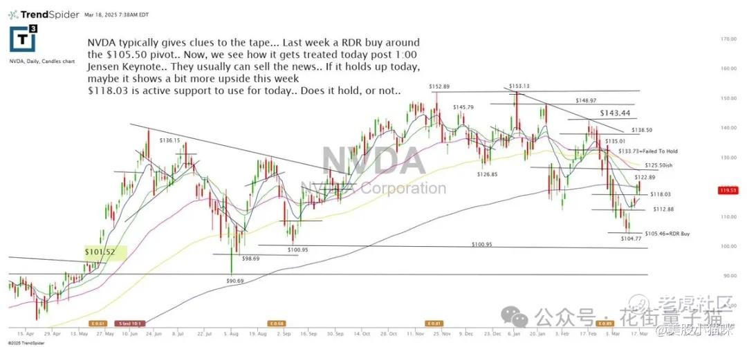 NVDA 通常会给市场带来信号,上周在 $105.50 附近形成 RDR 买点,现在我们看看今天 1:00 之后市场如何反应,Jensen Keynote 之后他们通常会卖出新闻,如果今天能守住,或许本周会有更多上涨空间,$118.03 是今天的关键支撑位,看它能否守住。