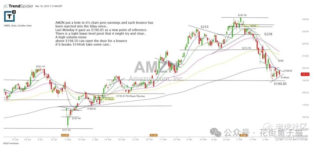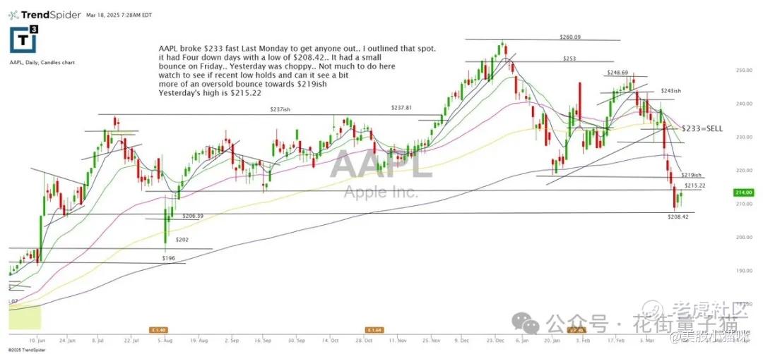 AAPL 上周一快速跌破 233 美元,促使投资者止损离场。我当时已经指出了这个点位。之后经历四个下跌交易日,最低触及 208.42 美元。上周五出现小幅反弹,昨天市场震荡,未见太多进展。现在关键是观察近期低点是否企稳,并看是否有更大的超卖反弹空间,目标 219 美元左右。昨日最高点为 215.22 美元。