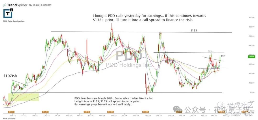 我昨天买了PDD的看涨期权以应对财报。如果它继续向133美元以上推进,我会将其转换为看涨价差交易以降低风险。PDD的财报将在3月20日公布,一些销售交易员非常看好。我可能会参与135/155美元的看涨价差交易,但最近财报交易并未取得很好的表现。