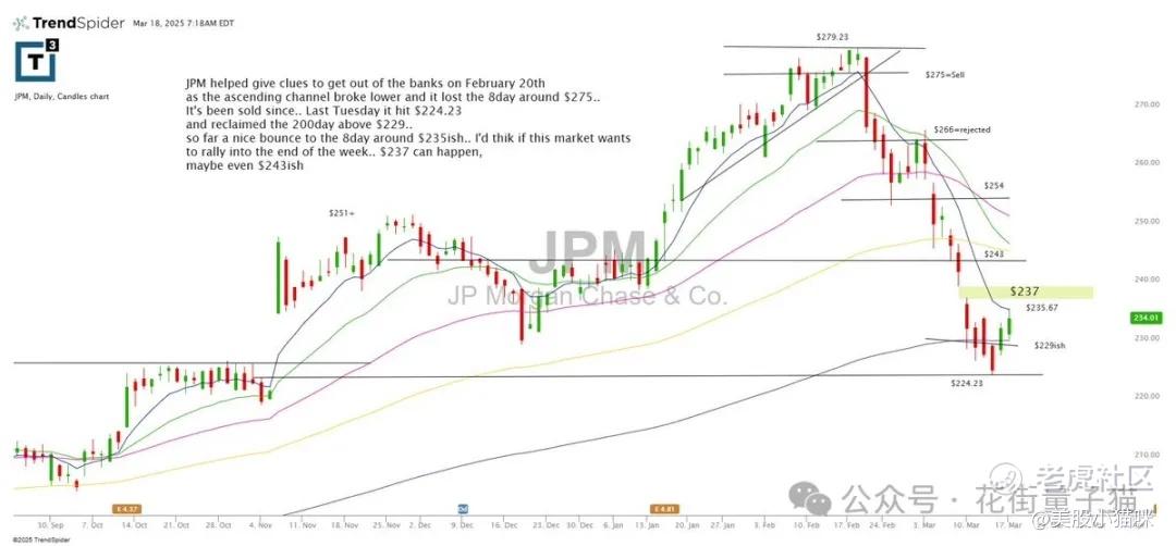 JPM 在 2 月 20 日给出了退出银行股的线索,因为上升通道破位,并在 275 附近失去了 8 日均线支持。之后持续被抛售……上周二触及 224.23,并重新站上 200 日均线 229。迄今为止,反弹到 8 日均线 235 附近……我认为如果市场本周末继续上涨,237 可能出现,甚至可能达到 243 附近。
