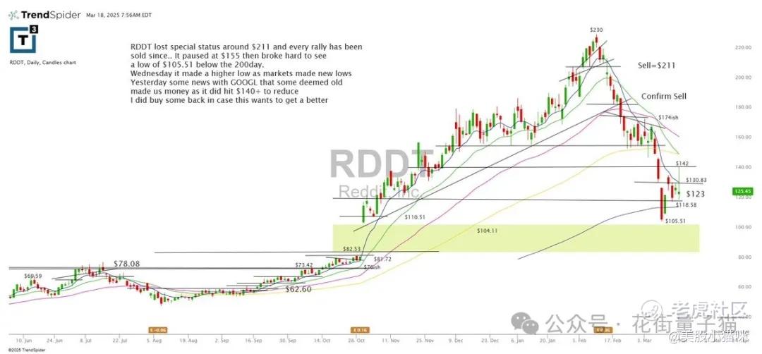 RDDT 在 $211 附近失去特别地位,此后每次反弹都被抛售,它在 $155 附近停滞,然后大跌至 $105.51,跌破 200 日均线,周三市场创新低时,它形成了更高的低点,昨天由于与 GOOGL 相关的消息,一些人认为是过时新闻,但股价上涨至 $140+,进行了一些减持,我又买回了一些,以防股价企稳回升。