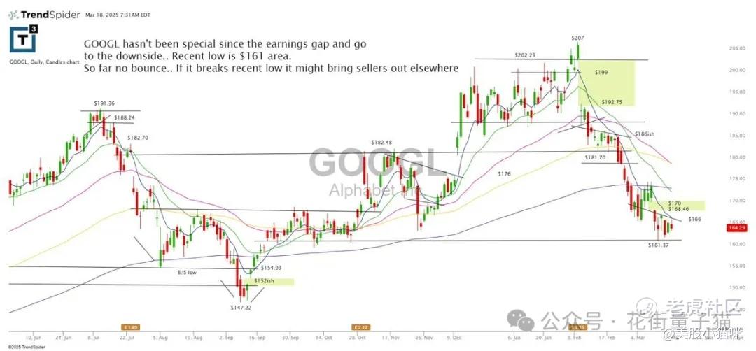 GOOGL 自财报缺口后一直没有表现出色,继续走低。近期低点在 161 美元附近。截至目前没有出现反弹迹象。如果跌破近期低点,可能会引发更多卖盘。