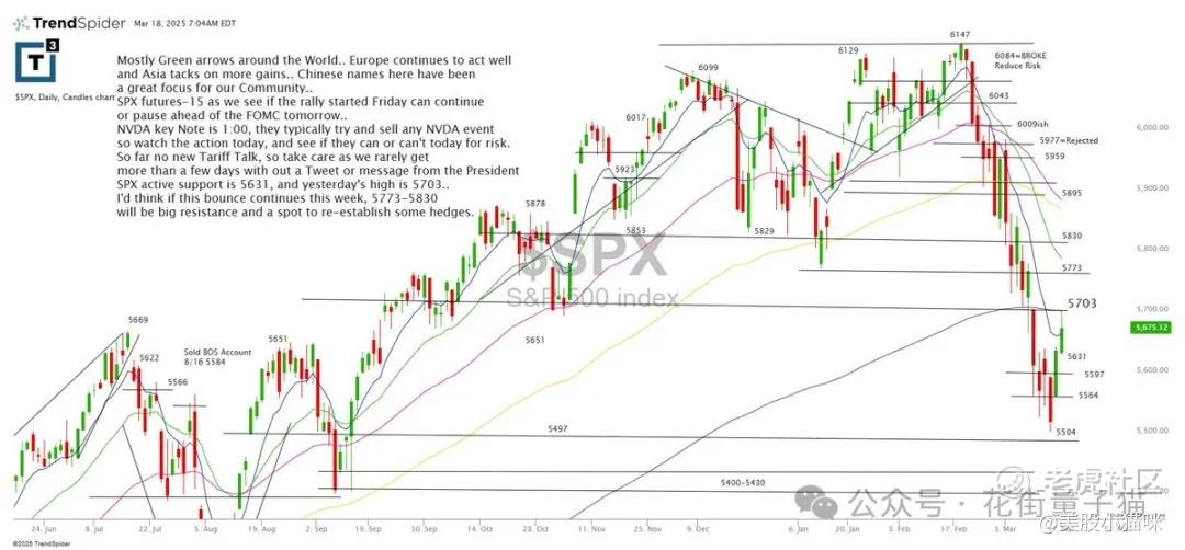 大多数地区以绿色箭头开启本周。欧洲持续表现良好,亚洲继续上涨。中国股票在我们的社区中成为关注焦点。SPX 期货上涨 15 点,我们要观察周五开始的反弹是否能继续,或者在 FOMC 会议前暂停。NVDA 的关键讲话在 1:00,他们通常会在任何 NVDA 事件中尝试卖出,所以要观察市场反应,看今天是否有风险交易的机会。至今没有新的关税讨论,因此要小心,因为总统很少会在几天内不发推文或消息。SPX 关键支撑位为 5631,昨天的高点是 5703。如果本周反弹继续,5773-5830 将是重要阻力位,也是重新建立对冲头寸的好时机。