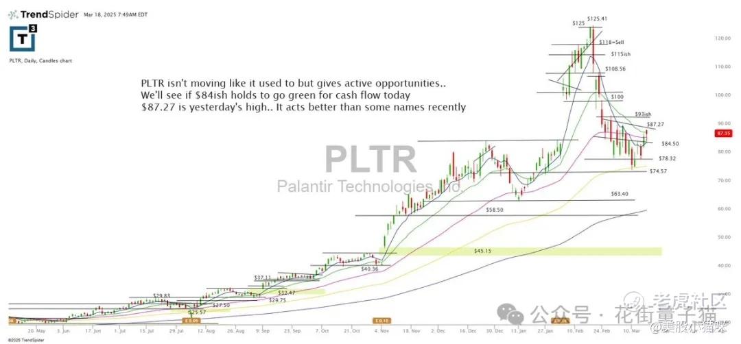 PLTR 走势不如以前活跃,但仍有交易机会,我们看看 $84 附近是否能守住,以便今天翻绿获取现金流,$87.27 是昨日高点,它最近的表现比其他股票要好。