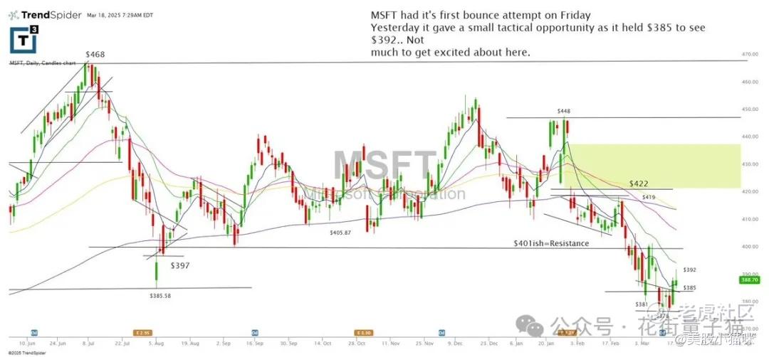 MSFT 上周五首次尝试反弹。昨日,它在 385 美元附近获得小幅战术性机会,最高反弹至 392 美元。目前仍无太多值得兴奋的信号。