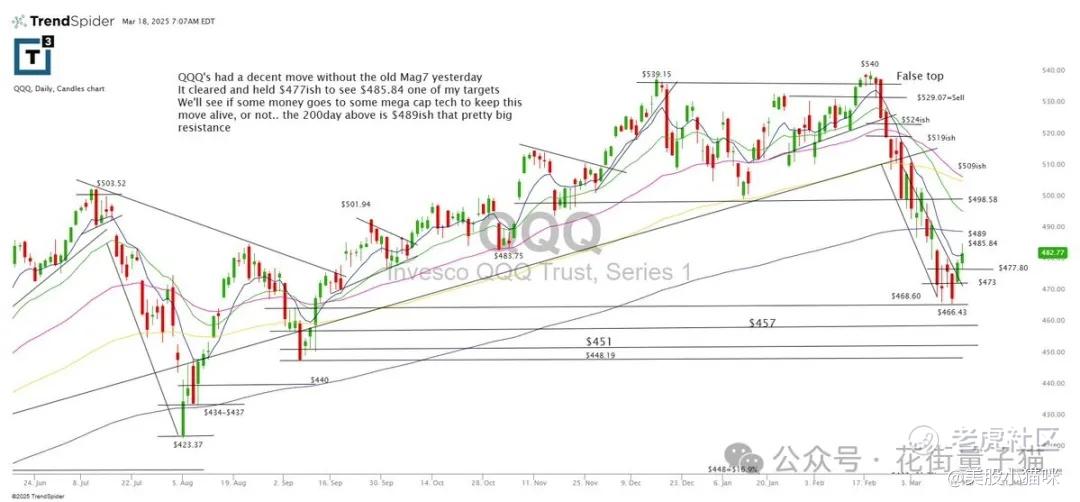 QQQ 昨天在没有旧 Mag7 的情况下表现良好。它突破并维持在 477 区域,看到了 485.84,这是我的一个目标。我们将看看是否有资金流入一些大型科技股以维持这一走势,否则……200 日均线在 489 附近,形成相当大的阻力。