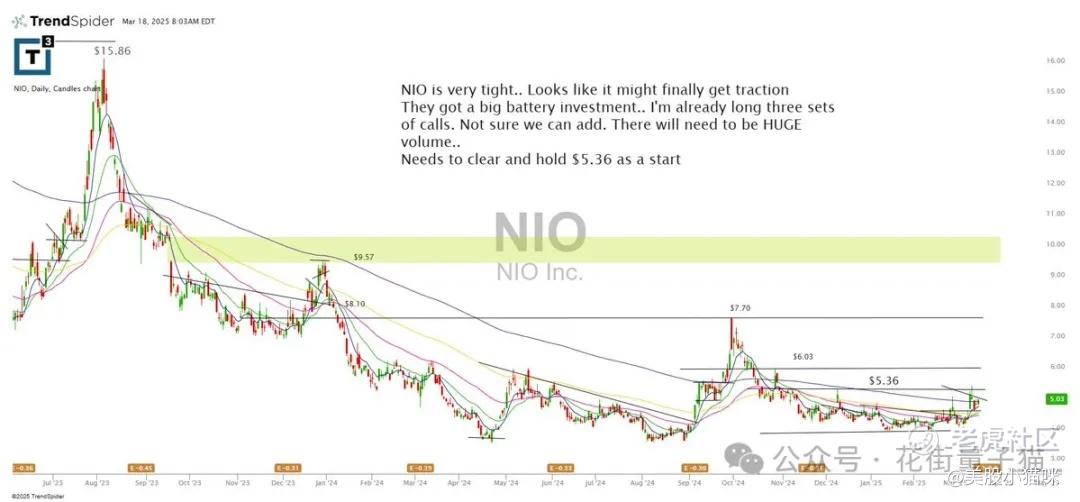 NIO走势非常紧凑,看起来可能终于要启动了。他们获得了一笔大型电池投资,我已经持有三组看涨期权。不确定是否还能加仓,这需要巨大的成交量。需要突破并持稳在5.36美元作为起点。