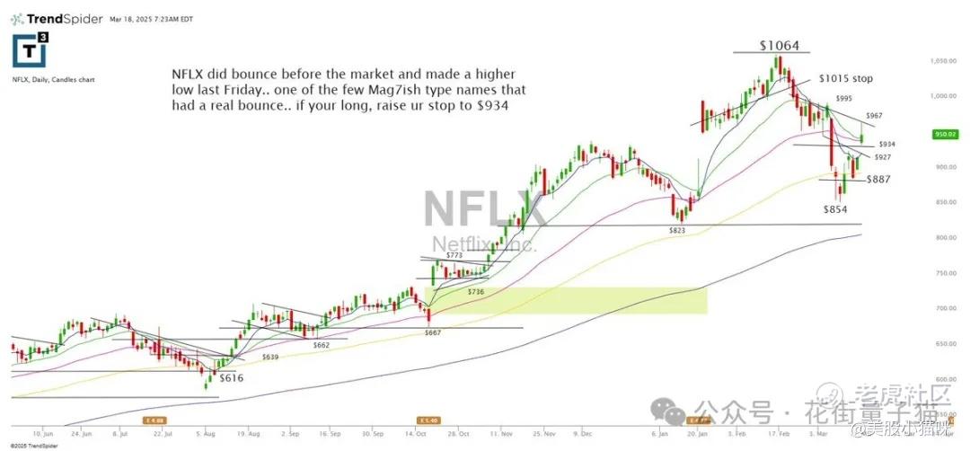 NFLX 在市场开盘前反弹,并在上周五创出更高低点。这是少数几个 Mag7ish 类型的个股中有真正反弹的。如果你持有多头,将止损提高到 934 美元。