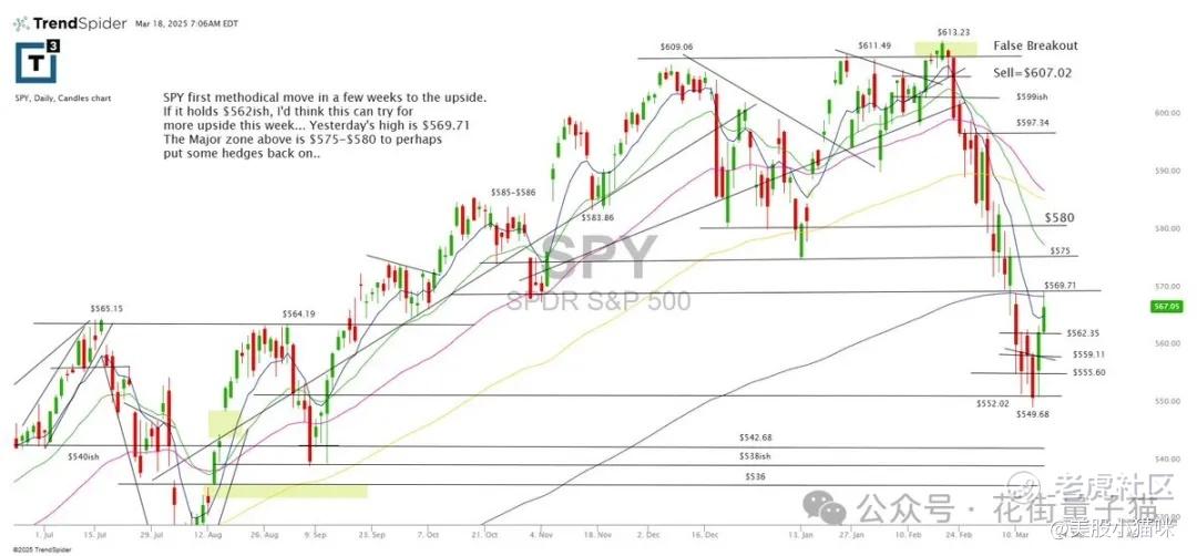 SPY 近期首次出现有序上涨。如果能维持在 562 左右,我认为本周有望继续上行……昨天的高点是 569.71。上方的主要阻力区间是 575-580,可能是重新建立部分对冲头寸的好时机。