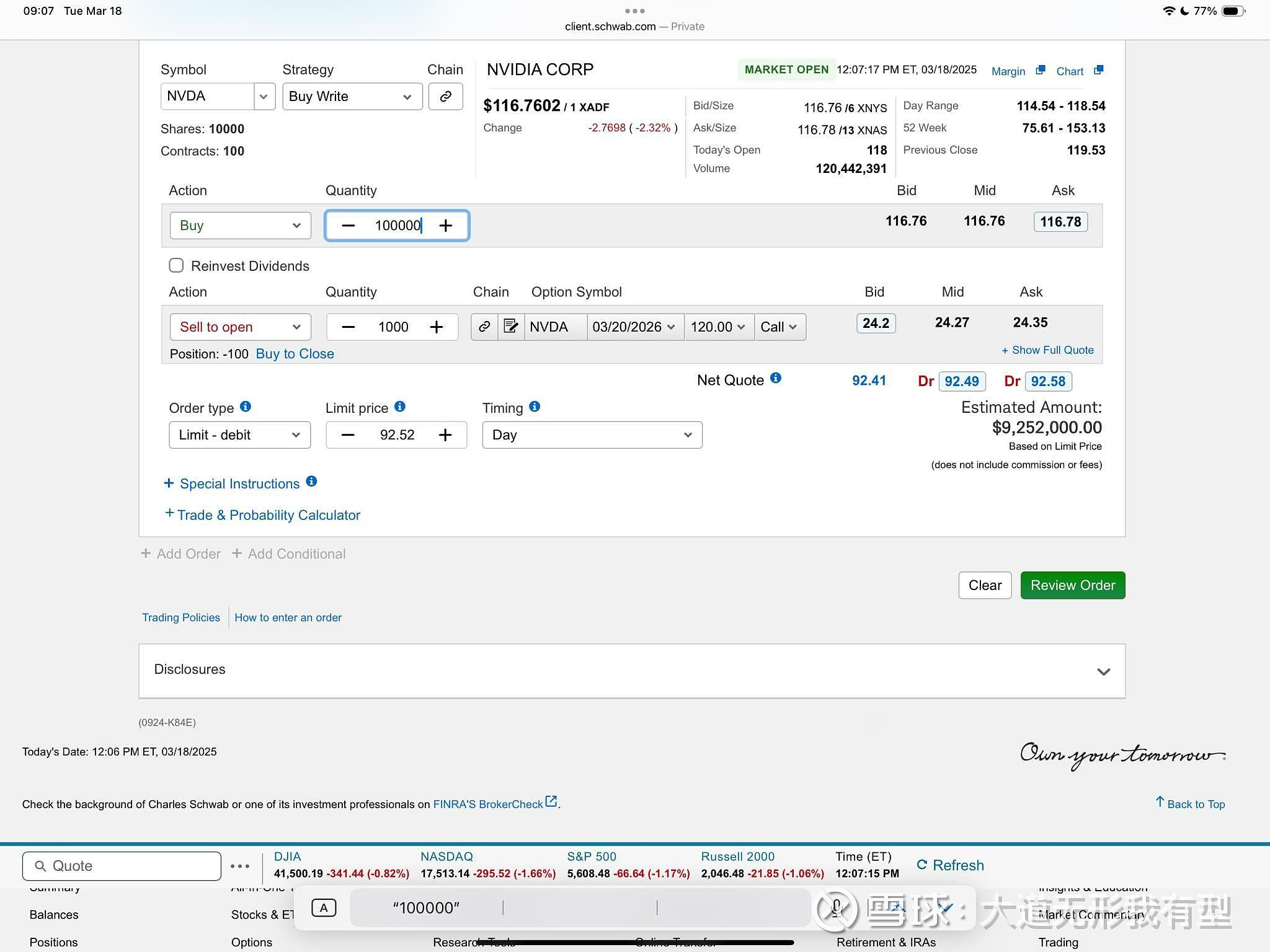 黄仁勋演讲开始前的一个小时,著名投资人段永平在雪球平台上晒出了自己对英伟达限价92.52美元的Buy Write策略买单,总价为9252000美元。