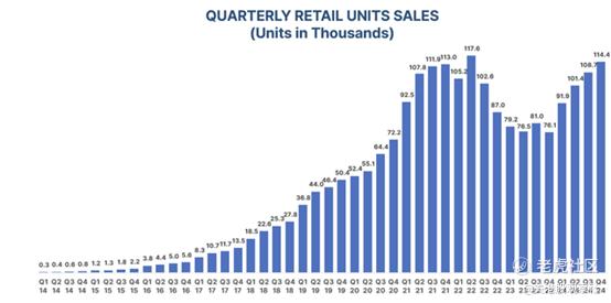 下图展示了公司零售销量的趋势,该数据环比和同比均有所增长,达到1.144亿,比上一年第四季度增长50%。